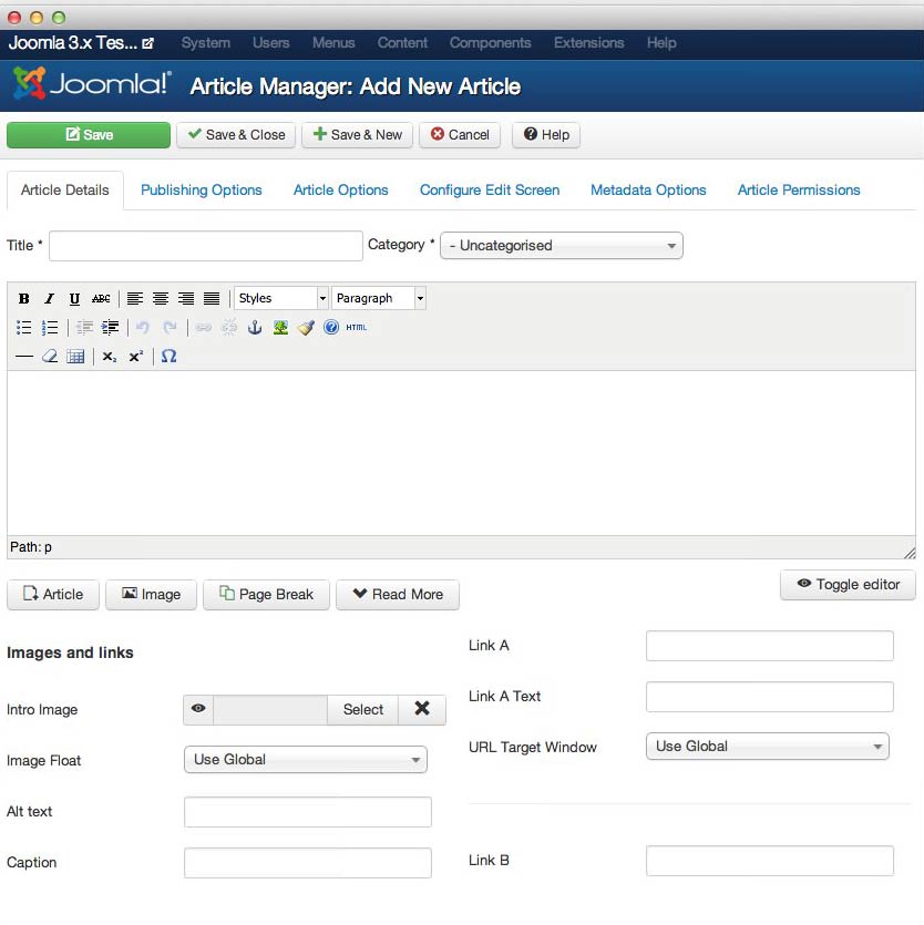 The Images and Links area of the article editing screen gives you the ability to add images in a way that is supported natively by various templates and modules.