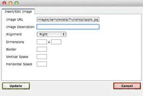 The integrated image tool built in to TinyMCE is very simple, though it does offer several useful features for refining how your image looks when placed in the inline editor.