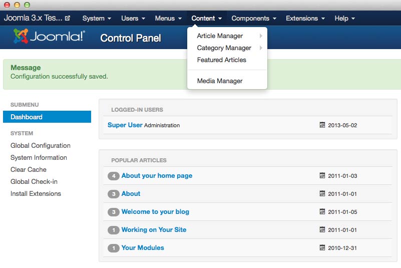Joomla version 2.5 (above) and 3.x (below) have very different default user interfaces, though much of the same basic principles apply to each. Both of these interfaces will require you to close specific menus before you can skip around to another, provide a dashboard complete with frequently accessed menus and general site information, and enable you to manage virtually every aspect of your site.